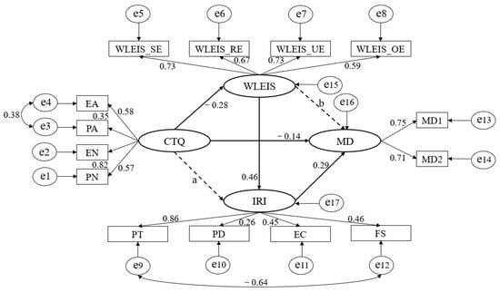 In addition, emotional intelligence and empathy are two closely related variables, and previous studies have provided supports that they are positively correlated [,]. Moreover, research has demonstrated that emotional intelligence can effectively promote empathy, which may be because high emotional intelligence groups can better perceive, comprehend and operate emotions, and then they can better comprehend their own and others’ emotions and the consequences of their behaviours, thus improving their empathy []. Therefore, we believe that childhood maltreatment may hamper emotional intelligence, and then, the lower emotional intelligence impedes the foundation of empathy, ultimately contributing to lower moral disgust. Thus, we proposed H4: childhood maltreatment negatively predicts moral disgust by affecting empathy through emotional intelligence.