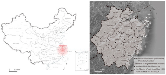 Since the reform and opening up in 1978, the economy in China has grown rapidly along with a fast urbanization rate; as a result, the quality of public services has increased drastically [1]. Welfare organizations and facilities set up for vulnerable populations, including the elderly, orphans and disabled people, have also developed to new heights in recent years. In the economically developed cities, there is a trend of public welfare facilities, such as nursing homes and orphanages, being shifted from the city’s central region to the close suburbs constructed together due to the further centralization of the land and resources [2]. Furthermore, the child abandonment rate has decreased significantly, as overall living standards have improved. As a result, some orphanages have been incorporated into welfare facilities parks and renamed as Children’s Group, which has aided the development of the integrated welfare facility model. For example, there are 50 integrated welfare facilities that have been built in Zhejiang Province, and only Hangzhou, its provincial capital, has two large-scale integrated welfare facilities with at least 100 children beds (Figure 1).