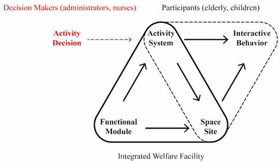 There is a dynamic balance system between the integrated welfare facilities having basic services and adequate space and the people living there. The primary purpose of promoting the joint activities in various functional modules of the facility is to encourage interaction between the two groups in order to foster a positive relationship with social attributes [8]. The core design logic of the space as the activity carrier derives from the “elderly–children joint activity” itself (Figure 2). Therefore, it is critical to clarify the appropriate system. The quality and characteristics of elderly–children operation systems and activities vary in different countries around the world. Even though these cases could be used as a guideline for the design of integrated welfare facilities in China, their applicability and adaptability in the new environment must be scientifically proven. Therefore, the decision-making mechanism behind them should be clarified to analyze the appropriate types of joint activities.
