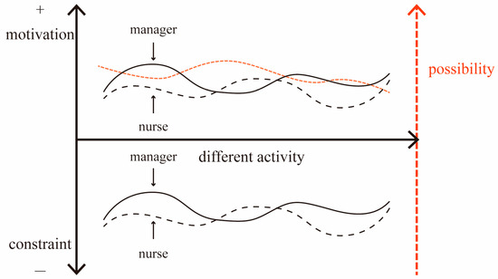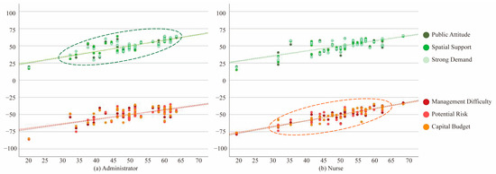 Three-dimensional scatter is a form of stereogram that illustrates the statistical relationship between pairs of variables. The X-axis represents the deviation value of feasibility, while the Y-axis represents the level of deviation for six different types of motivations and constraints. In Figure 8, most of the data points of the administrators’ and nurses’ motivation and constraint values are concentrated areas, with only a small portion of the data “deviating” from most of the data set. The tendency of the evaluation of motivation and constraint values made by the administrators and nurses also has a similar increase along with the rise in feasibility. Therefore, the two groups have similar evaluations on the interaction relationship between the “motivation–constraint” factors and feasibility. However, the consistency of the nurses’ evaluations of the constraints and feasibility is more concentrated than the one of the administrators’, particularly in terms of the cases of low-feasibility activities. Meanwhile, the degree of association of the evaluation of activity constraints and feasibility made by the nurses is higher than the one of the administrators. This reflects the difference in the division of responsibilities of these two groups. Administrators can reach a more consistent view on the motivation evaluation in the decision-making process relatively easily, whereas nurses have a better understanding of the constraints and difficulties encountered during the implementation phase.