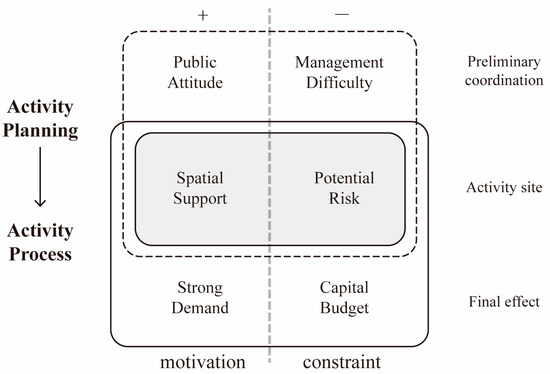In this model, “motivation” is the positive influencing factor that stimulates the occurrence of the joint activities [24], including demands, reasons and satisfaction of the activities [25], which are generally regarded as homogenized positive incentives [26]. On the other hand, “constraints” are factors restricting the occurrence of the activities, which are divided into limitors and prohibitors [22] depending on the extent of the influencing factors affecting the activities. Restrictive constraints will only restrict the occurrence of the activities to some extent instead of fully canceling the activities; however, when prohibitive constraints reach some degree, the activities would not occur at all [27]. However, the feasibility of activities is not bound to decrease when facing constraints because appropriate negotiation would counteract the negative effect that constraints create. According to the model of the leisure constraint theory [28], Jackson emphasizes the impact of negotiation instead of the result of participating or not [29]. In the research of leisure constraint negotiation, some scholars use regression and structural equation modeling programs to test four models, which are independence, negotiation buffer, constraint effects mitigation and perceived constraint reduction [30], which proves motivations’ and constraints’ influence on the leisure negotiation and feasibility of activities.