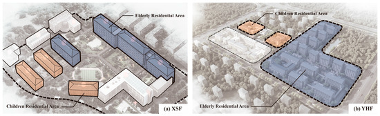 To avoid the differentiation of the decision-making bodies and other decision-making factors of the elderly and children activities caused by the different regions of welfare facilities, this research chooses two typical integrated welfare facilities in Hangzhou (Figure 5), which are the Xiao Shan Welfare Facility (XSF) and the Yu Hang Welfare Facility (YHF). Although in the aspect of space condition these two integrated welfare facilities, respectively, belong to the “joint-construction” type and the “adjoining” type and vary in their sizes, they both adhere strictly to the integrated welfare facility architecture design standard at the administrative district level. Additionally, after construction, both of them are under the jurisdiction of the same government sector, which is the Civil Administration Office in Zhejiang Province. Additionally, there is a certain degree of similarity between the groups of people, including the elderly, children, administrators and nurses. Furthermore, both of them have a certain number of joint activities that occur with a certain frequency (Table 3).