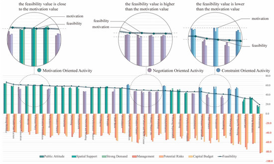 After standardizing the deviation value of the average value of motivation, constraint and feasibility, various activities were ranked from high to low in terms of their feasibility, as shown in Figure 6. It shows that all three factors of motivation values of each activity were relatively approximate, while there was sometimes a large gap between the different constraint values (for example, the degree of the capital budget was sometimes significantly higher than the other two types of constraint values), which indicates that decision makers tended to consider the motivation values of elderly–children activities as a whole as a prerequisite. However, they would come up with more target-specific analyses when dealing with the constraints encountered later.