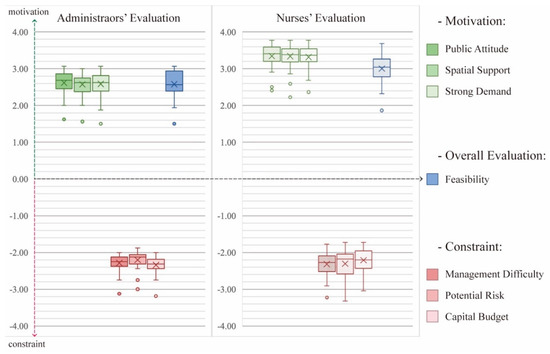There is a significant difference between the administrators’ and nurses’ original values of motivation and constraints (Figure 7). The values of nurses’ evaluation on motivation and feasibility mostly gathered in a range from 3 to 4, and the overall values of the average feasibility values were higher than the administrators’ evaluation values, which shows that nurses have a more optimistic attitude toward those activities. Additionally, the nurses’ evaluation of constraint values was more dispersed than the distribution of the ones of the administrators. As the two types of decision makers have different evaluation ranges for the activities, it is difficult to compare the values directly. Therefore, it is necessary to conduct a deviation value computation and compare the values of activity motivation, constraint and feasibility based on their evaluation levels.