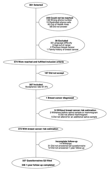 - Pons-Rodriguez, A.; Forné Izquierdo, C.; Vilaplana-Mayoral, J.; Cruz-Esteve, I.; Sánchez-López, I.; Reñé-Reñé, M.; Cazorla, C.; Hernández-Andreu, M.; Galindo-Ortego, G.; Gabandé, L.; et al. Feasibility and acceptability of personalised breast cancer screening (DECIDO study): Protocol of a single-arm proof-of-concept trial. BMJ Open 2020, 10, e044597. [Google Scholar] [CrossRef] [PubMed]