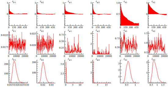 | Parameter | Mean Value | Standard Deviation | 95% Confidence Interval | Geweke | Non-Effective Factor |
