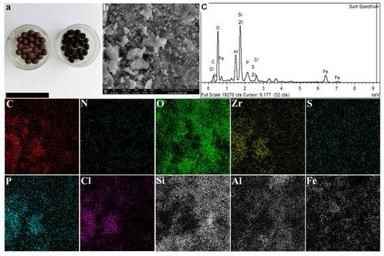 In energy- and environmental-related areas, the difficulty in catalyst recycling is a bottleneck that restricts the practical application of powder-form catalyst. To overcome this drawback, we then chose ceramsite as a host material to immobilize the powder-form catalyst of H+/BCQDs/UiO-66-NH2, forming an easily recyclable immobilized catalyst of H+/BCQDs/UiO-66-NH2@ceramsite. As depicted in Figure 2a, the ceramsite features a brown color with a round shape, while the color changed dark brown after the loading of H+/BCQDs/UiO-66-NH2. The dark color shown here not only suggests the successful immobilization of catalyst on the ceramsite, but also reflects the excellent light absorption property of the as-prepared immobilized catalyst [,] (which can be further confirmed by the DRS results shown in Figure 5c). Furthermore, it is easy to find in Figure 2a that there are abundant pores on the surface of the ceramsite, which may help to immobilize the catalyst. This can be further supported by the elemental mappings shown in Figure 2, where the H+/BCQDs/UiO-66-NH2 composed elements are found to be well distributed on the ceramsite. Especially, the Cl element is also found distributed on the material with an atomic content of 1.7%, demonstrating the successful installation of active sites on the immobilized material. Based on the above analysis, the immobilized H+/BCQDs/UiO-66-NH2@ceramsite catalyst has been successfully fabricated.