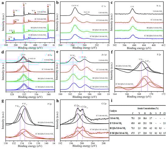 XPS spectra of UiO-66-NH2, H+/UiO-66-NH2, BCQDs/UiO-66-NH2, and H+/BCQDs/UiO-66-NH2. (a) Survey; (b) C 1s; (c) N 1s; (d) O 1s; (e) Zr 3d; (f) S 2p; (g) P 2p; (h) Cl 2p, and (i) the corresponding elemental contents.