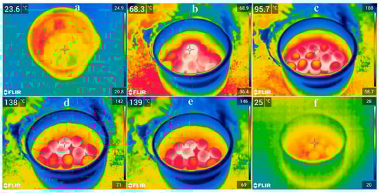 Photo-to-thermal conversion performance of H+/BCQDs/UiO-66-NH2@ceramsite after different IR light irradiations. (a) 0 h; (b) 1 h; (c) 2 h; (d) 3 h; (e) 4 h; (f) light off and stand for 15 min.