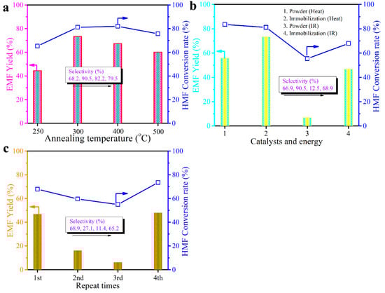 Based on the above analysis, we then carried out the catalytic etherification reaction by using the immobilized material of H+/BCQDs/UiO-66-NH2@ceramsite using IR as input driven energy. Firstly, we studied the effect of calcination temperature during the immobilization of BCQDs/UiO-66-NH2 on the ceramsite on the final catalytic activity. As shown in Figure 7a, the EMF yield increased from 44% to 73% with the increase in annealing temperature from 250 to 300 °C. The enhanced catalytic activity was due to the strengthened interactions between the BCQDs and UiO-66-NH2, which suppressed the side reaction during the etherification of HMF to EMF. However, further raising the annealing temperature would more or less destroy the skeleton of the MOFs, thus reducing the catalytic activity. In addition, the higher temperature would inevitably lead to the sintering of the material, effecting the interactions between the BCQDs and UiO-66-NH2 []. As a result, both the EMF yield and HMF-to-EMF selectivity were decreased. Based on the above analysis, we can conclude here that the optimized post calcination temperature to strengthen the interactions between BCQDs and UiO-66-NH2 as well as the adhesive of BCQDs/UiO-66-NH2 on ceramsite is 300 °C.