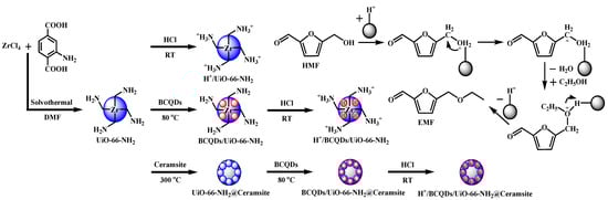 Illustration of proposed synthetic procedures for the fabrication of H+/UiO-66-NH2, H+/BCQDs/UiO-66-NH2, and H+/BCQDs/UiO-66-NH2@ceramsite acid catalysts and the etherification of HMF with ethanol into EMF.