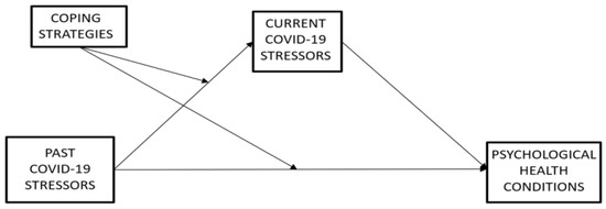 Therefore, the study aimed to simultaneously test the associations between Past-COVID-19-stressors and Current-COVID-19-stressors as moderated by Coping Strategies and the associations between Past-COVID-19-stressors and psychological health conditions as mediated by Current-COVID-19-stressors. Accordingly, the following hypotheses were developed and tested: