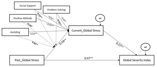 The Mediated-Moderated model of Past and Current Global Stress, Coping Strategies, and Global Severity Index. Moderating effects values are reported in bold along the dotted arrows. ** p < 0.01; * p < 0.05.