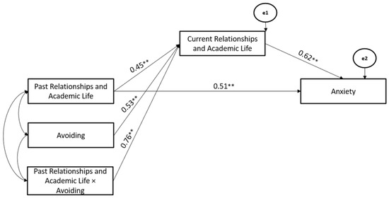 The Mediated-Moderated model of Past and Current Relationships and Academic Life stressors, Avoiding Coping Strategy, and Anxiety. ** p < 0.01.
