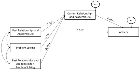 The Mediated-Moderated model of Past and Current Relationships and Academic Life stressors, Problem Solving Coping Strategy, and Anxiety. ** p < 0.01; * p < 0.05.