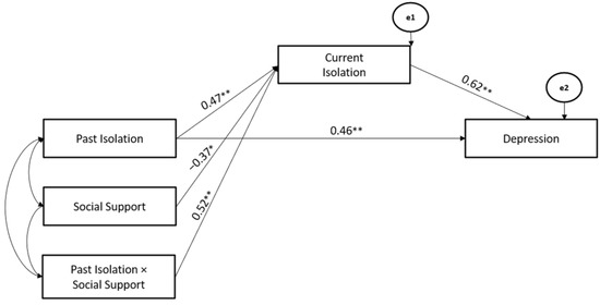 The Mediated-Moderated model of Past and Current Isolation stressors, Social Support Coping Strategy, and Depression. ** p < 0.01; * p < 0.05.