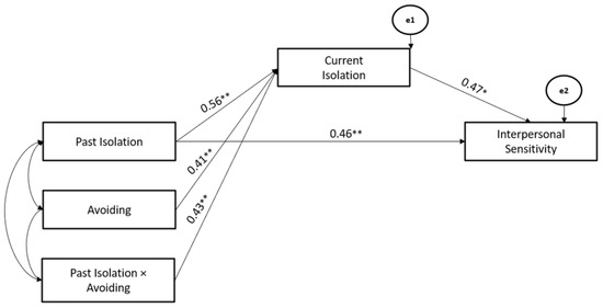 The Mediated-Moderated model of Past and Current Isolation stressors, Avoiding Coping Strategy, and Interpersonal Sensitivity. ** p < 0.01; * p < 0.05.