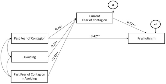 The Mediated-Moderated model of Past and Current Fear of Contagion stressors, Avoiding Coping Strategy, and Psychoticism. ** p < 0.01; * p < 0.05.