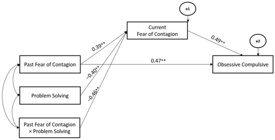 The Mediated-Moderated model of Past and Current Fear of Contagion stressors, Problem Solving Coping Strategy, and Obsessive-Compulsive symptoms. ** p < 0.01.