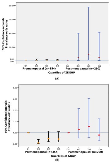 (A) Prevalence odds ratios for the association between urinary ∑DEHP metabolites concentrations and metabolic syndrome stratified by menopausal status in females. (B) Prevalence odds ratios for the association between urinary MBzP concentrations and metabolic syndrome stratified by menopausal status in females. Prevalence odds ratios adjusted for urinary creatinine, age, education, and working status.