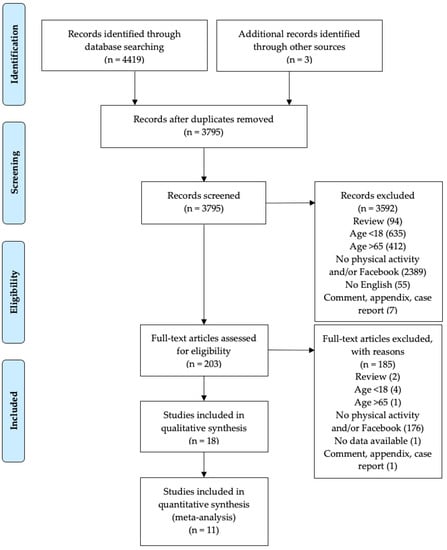 This is a systematic qualitative review and meta-analysis of the literature that aimed to summarize and analyze the influence of Facebook support on the PA practice and how this can improve physical well-being in the general population. The Preferred Reporting Items for Systematic Reviews and Meta-Analyses (PRISMA) guidelines and flow chart diagram were used to report this systematic review and meta-analysis [19,20].