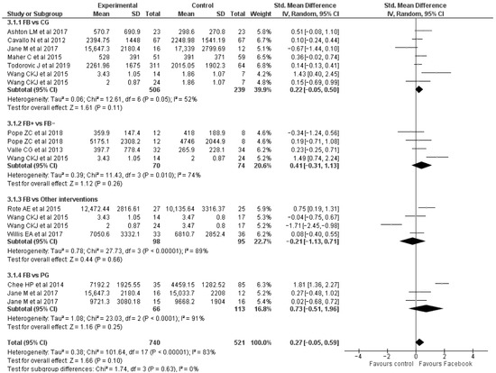 Meta-analysis was performed for the overall PA parameter, using random-effects models with confidence intervals set at 95%; effect size (ES) was calculated through Review Manager 5.4 software (Copenhagen, Denmark, The Nordic Cochrane Centre, The Cochrane Collaboration, 2020). The ES was calculated as standardized mean difference ΔMean/SDpooled, where ΔMean is the difference between the post-intervention mean of the Facebook (FB) Group and Control Group, and SDpooled is the mean of the post-intervention standard deviation, summarizing the different tests evaluating the same parameter. Overall, ES consisted of FB group compared with all the different control groups, including established Control Group (CG), Paper Group (PG), Phone Conference Group (PhC-G), Standard Walking Intervention Group (SWI-G), and Exercise Group (EG). The ES is a measure of the effectiveness of a treatment, and it helps determine whether a statistically significant difference is a difference of practical concern. The interpretation was performed according to guidelines by Cohen [38] and Sawilowsky [39], where an ES value of 0.20 indicates a small effect, ES of 0.50 indicates a medium effect, ES higher than 0.80 indicates a large effect, ES value of 1.20 indicates a very large effect, and an ES value of 2.0 indicates a huge effect.