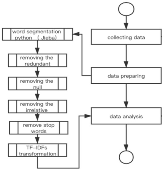 To prepare the data collected for LDA, we applied a few techniques to pre-process the datasets [27,28,29]. As shown in Figure 1, we first conducted word extraction and segmentation with Jieba in Pyhton, Jieba was widely used in many Chinese text mining and sentiment analysis studies. In the second step, we cleaned null content such as missing data from the datasets. In the third step, we removed common stop words such as “is”, “are”, and “them”, from Chinese vocabulary, which have no specific meanings. Lastly, we conducted TF-IDF (term frequency inverse document frequency) transformation to give more weight to those words appearing with high frequencies only in our datasets. TF-IDF is a commonly used pre-processing technique for text mining [30].