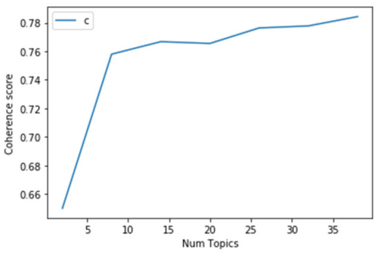 LDA is a widely used technique in text mining for analyzing data [26,31,32]. One critical question in LDA is to decide the optimal number of topics emerging from a given dataset. While scholars in the past have relied on various creative approaches to this question [33], one commonly adopted method to determine the optimal topical number is to obtain the coherence score, as recommend by Stevens and his colleagues (2012) [34], through calculating the most representative words’ semantic similarities in a topic. The arithmetic mean of these similarities is then calculated to represent the level of consistency for each topic [35].