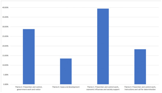 Likewise, from the news data, regarding Theme 1, newspapers report prevention and control work from a viewpoint of economic and societal influences, such as enterprise influences, society donations, and support. With a relatively large proportion of information for this category of news, misinformation of this kind has less room to increase.