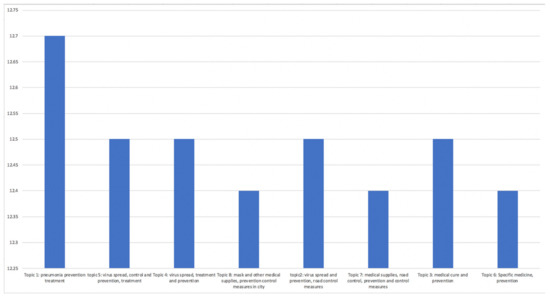 With the genism package in python, we calculated the coherence value of different topic number [32,33]. When there were eight topics, we found that the coherence value was 0.5109 (see Figure 1); increasing number of topics will result in a growing coherence value, but it increases more slowly after reaching eight as the topic number.