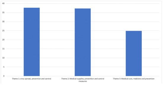To compare the news data with the misinformation data, we also conducted an LDA analysis to illuminate the major topics and themes. There are eight topics of misinformation that we generated, and we categorized them into three different themes (see Figure 3 and Table 2). The theme with the largest proportion in relation to the COVID-19 outbreak from news media is “Theme 1: virus spread, prevention and control” consisting of 37.7% of all news, “Theme 2: Medical supplies, prevention and control measures” (37.3%) is the second biggest theme, which is followed by the third one “Theme 3: Medical cure, medicine and prevention” (24.9%) (see Table 2).