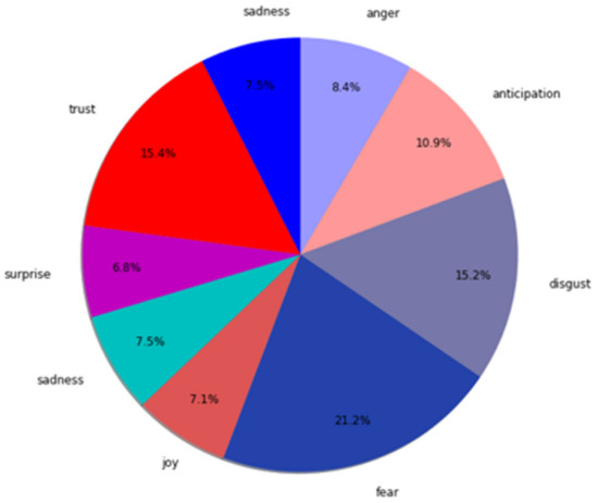 To answer RQ2, we implemented sentiment analysis to answer RQ2 about the possible emotions that drove the transmission of the misinformation on social media, as emotion has been identified as a notable predictor of the spread of misinformation. The sentiments that emerged from the misinformation data could provide a gateway to understanding the public emotional states expressed in the spread of misinformation on the coronavirus during the early stage of the COVID-19 outbreak in China. Researchers have conducted studies on different emotions expressed in misinformation with a popular lexicon provided by National Research Council Canada (NRC) [27]. This lexicon has been widely used for analyzing emotions expressed in tweets [27], news [28], and customer reviews [29]. We adopted this leading lexicon to analyze eight emotions based on Plutchik’s emotion classification (2001)—anger, fear, anticipation, trust, surprise, sadness, joy, and disgust [30]—to process the misinformation data. The lexicon can process text in different languages including Chinese for the eight types of emotions.