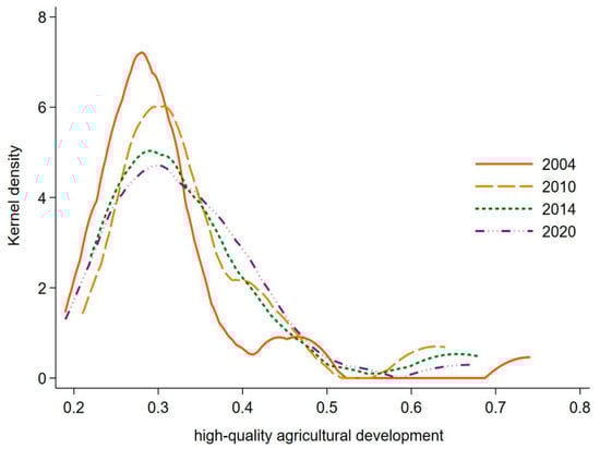 Kernel density of high-quality agricultural development from 2004 to 2020.