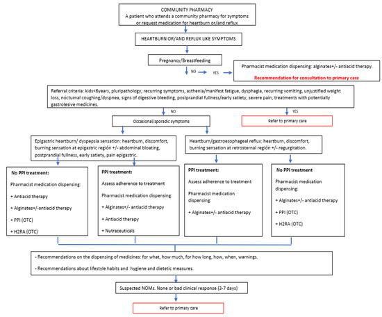 Heartburn and/or reflux-like symptom management algorithm in community pharmacy.
