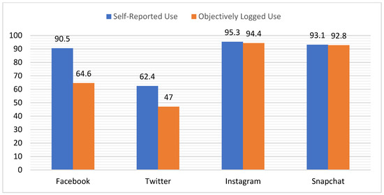 Recent surveys of American adolescents have revealed patterns of frequent and heavy use of Snapchat and Instagram coupled with dwindling Facebook and Twitter engagement [32,33,34,35].. Meanwhile, research in the domain of behavior measurement suggests that self-reports of behavioral data are often inaccurate especially if the behaviors in question comprise habitual and indistinct events such as frequency of anger or smartphone use [36,37]. Given that recent data suggests that young adults may engage in the habitual use of some SM platforms (Instagram, Snapchat) more than others (Facebook, Twitter), it follows that there may also be platform-based differences in the accuracy with which students self-report their use. Likewise, Junco [18] proposed that students’ estimates of their Facebook use may have been inflated by stereotypes and media depictions of young adults as heavy Facebook users. However, since 2013, stereotypes around SM use have shifted considerably with Facebook now recognized as tremendously popular with older adults, and consequentially, less frequented by young people [38]. In contrast, today’s news stories, song lyrics, and television shows more frequently reflect the popularity of Instagram, Snapchat, and other image-based platforms among youth [39,40] potentially making young adults more likely to overestimate their own use of these popular SM platforms. This prediction is consistent with the finding that behaviors recognized to be normative in the peer group are commonly over-reported in surveys due to identity processes and self-perception [29,30,31].