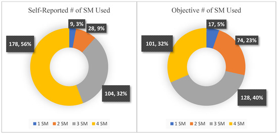 As proportionally depicted in Figure 2, the number of SM platforms used by participants significantly differed by assessment type, t(318) = 12.14, p < 0.001, with the number of SM platforms used according to self-report (M = 3.41, SD = 0.77) exceeding those used according to objective data (M = 2.97, SD = 0.87). By sex, male (M = 3.38, SD = 0.84) and female (M = 3.43, SD = 0.72) participants did not significantly differ in the number of SM platforms they self-reported using, t(318) = −0.61, p = 0.54. However, objectively, males (M = 2.84, SD = 0.95) logged time on significantly fewer platforms than did females (M = 3.06, SD = 0.80).