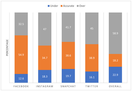Percentages of students under-reporting, accurately reporting, and over-reporting their social media use by platform and across all platforms among all participants.