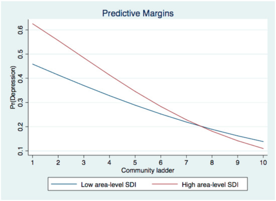 Interactive effect between community ladder and area-level SDI on depression among women.