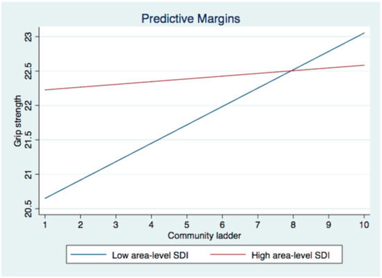 Interactive effect between SES ladder-community and SDI on grip strength among women.