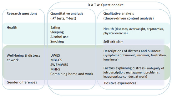 The qualitative data (open-ended questions) were analyzed using a theory-driven analysis. Individual comments (single words or short expressions) concerning any issue that was related to the topic of the research (e.g., health or illnesses, stress, burnout, work load, working times, duties, ergonomics, management, harassment, family, congregation, sleep, eating, exercising, pandemic) were first extracted and classified; new classes were added as new content was found. During this process we extracted comments regardless of the original question; for example, whenever the participants wrote something about their ergonomics, the comment was classified accordingly regardless of whether it was a response to the question asking about their health or about changes caused by COVID-19. The classes were then grouped according to the research questions and with the help of the theory as follows: Category 1 included comments on health; Category 2 included comments on workload, distress and burnout, and Category 3 included comments that gave reasons for the experiences in Category 2. Comments containing self-criticism, which were written solely by female participants, were collected outside the theoretical framework. They were included in Category 1 because they aways related to either eating, being overweight or exercising. Finally, we analyzed pandemic-related positive experiences that formed Category 4. Figure 1 shows the study in outline.