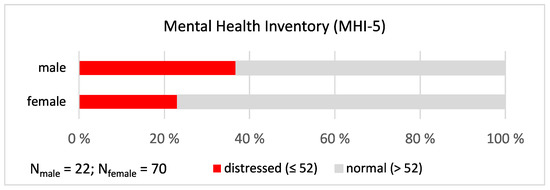 The participants’ responses on the Mental Health Inventory (MHI-5) were summed and the sum scale modified to be from 0 to 100. Using the cut-off point 52, we determined the proportion of church musicians who had psychological distress on the level that is clinically significant and needs to be treated (see e.g., [30]). This analysis revealed the alarming result that more than one third (36.8%) of male and nearly one fourth (23.1%) of female church musicians were distressed, but the responses were not gendered (χ2 = 1.117, p = 0.291; see Figure 6). The figures were clearly higher than those of the general Finnish population (13.6% of males and 14.9% of females) [8].