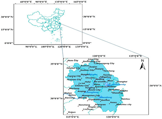 As shown in the blue area in Figure 1, the study area is where the Yangtze River Delta region is located. Some cities involved in the study and the locations of related rivers are marked in the figure. The Yangtze River Delta region has always been characterized by strong economic vitality, a high level of development, an excellent ecological environment, and a profound historical and cultural heritage. It is an important strategic part of China’s socialist modernization construction. As of the end of 2019, the Yangtze River Delta had a population of 227 million and an area of 358,000 square kilometers. The urbanization rate of the permanent population exceeds 60%, which is less than 4% of the country’s land area, creating nearly one-quarter of China’s total economic output and one-third of China’s total import and export volume. The Yangtze River Delta region itself has unique and advantageous geographical conditions, with riverside and seaside, vertical and horizontal rivers, excellent natural endowments, a good ecological environment, better environmental protection level and effectiveness than the whole country, and a solid economic foundation.