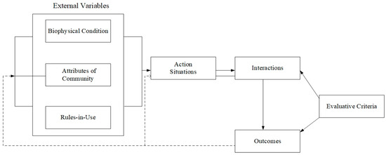 One of the challenges of applying institutional theory to a policy setting is translating key concepts into reliable strategies that can be observed. The Institutional Analysis and Development (IAD) framework defines institutions as “shared concepts that humans use in repetitive contexts organized by rules, norms, and policies” [20]. The framework was first proposed by the Ostroms in 1982 and has been continuously developed since then and widely used in the analysis of different practical situations. As a theoretical analysis framework, three groups of exogenous variables, such as natural material conditions, community attributes, and application rules, as well as action situations and results, are the core elements of the institutional analysis and development framework [21].