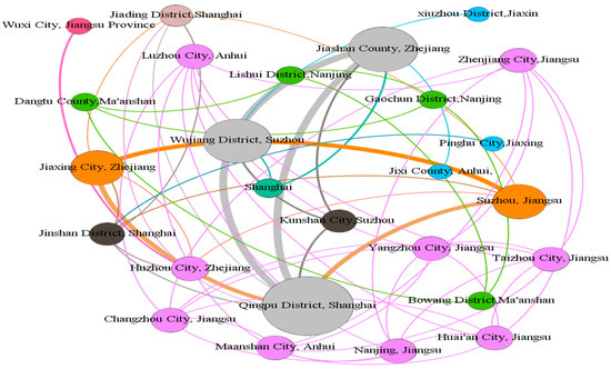 Gephi was used to build the overall ecological collaborative governance cooperation network in the Yangtze River Delta region, as shown in Figure 4 below, with different colored lines representing the cooperation network between different regions, and the thickness of the lines indicating the degree of cooperation between different regions. The size of the label indicates that the region has a high degree of centrality in the overall cooperation network, that is, it can participate more in cooperation in different regions in the ecological collaborative governance.