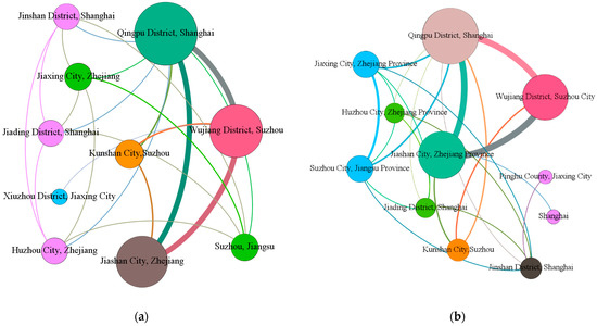It can be seen from Figure 5 in combination with Table 3 that the cooperation is denser in a and b. Most of the cities between the two collaborative governance and cooperation between the two are the same. There are intersections in ecological governance. The overall cooperation network of the basin is not large, mainly based on Shanghai Qingpu, Wujiang, Suzhou, and Jiashan, Zhejiang.