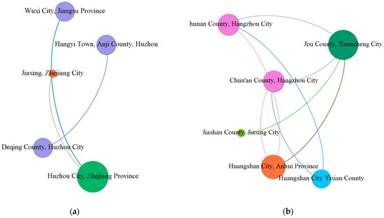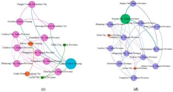 In Figure 6, in terms of a, b, c, and d, the gap between the cooperation in the four basins is large. a and b have the center points of their own cooperation network but involved a small city, which has formed a small child group. Additionally, c and d involve many cities but the frequency of cooperation between cities is low, so it is difficult to form a good cooperation network such as Figure 5a,b.