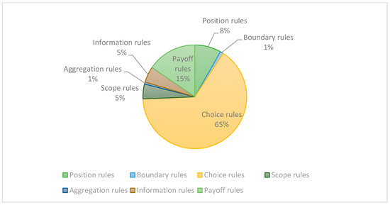 Ostrom summarized the application into seven rules: position, boundary, choice, scope, aggregation, information, and payoff rules [24]. The cumulative effect of these seven rules affects different aspects of the action scenario, and each rule type affects the structure of the action scenario. The relevant rules are described according to Table 1. Position rules determine the positions of participants [23]; boundary rules affect the number of participants, their attributes and resources, whether they are free to enter, and the conditions for leaving [20]; choice rules assign roles on a particular node, i.e., a collection of actions that must or cannot be taken and are linked to outcomes [23]; scope rules define potential outcomes that may be affected and limit actions associated with specific outcomes [24]; aggregation rules affect when actors choose actions, i.e., the level of control performed [23]; information rules affect participants’ knowledge information sets [24]; and payoff rules affect the benefits and costs assigned to specific combinations of actions and outcomes, thereby determining the motivation and deterrence of actions [24].