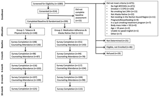 Participants were 299 men and women aged 19 or older, identifying as Alaska Native, residing in 1 of 16 communities in Alaska’s Norton Sound region, with population sizes ranging from 150 to 3598 (which is the population size of Nome). Approximately 76% of the region’s population is of AN heritage, with the largest representation being Inupiaq and Yup’ik. Participants were recruited between 2015 and 2018 through comprehensive, community outreach and community engagement [29]. Additional inclusion criteria were: English-literate; smoking 5 or more cigarettes per day; having high blood pressure (systolic/diastolic BP ≥ 140 mmHg/90 mmHg) or high cholesterol (LDL ≥ 160) or currently prescribed antihypertensives or cholesterol-lowering medication [30]. Exclusion criteria were BMI > 50, being pregnant, or currently receiving tobacco cessation treatment.