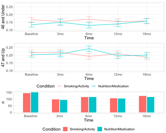 For the traditional heart-healthy foods ratio, there was a higher-order significant interaction effect for condition × time × age at 6 months (beta = 0.0036, p = 0.013). To better understand treatment response by age, we ran a median split of the sample’s age (47 years old) and depicted the ratio of traditional heart-healthy over time by condition. As shown in Figure 2, participants 47+ years old receiving the nutrition intervention had a significant group difference at 6 months (beta = 0.062, p = 0.031) that then waned, while for participants 46 and under, the intervention had no impact. Figure 3 displays the means and standard deviations for the traditional heart-healthy food servings over time within age group by condition.