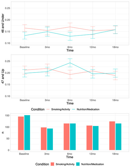 Plots for the estimates at each time point were made with the R package emmeans. The study was powered to detect changes in tobacco use, and this paper reports on the study arm that received diet and medication adherence counseling. Our sample size did not provide sufficient power to perform alpha corrections for the multiple outcome measures in this multiple risk behavior trial.